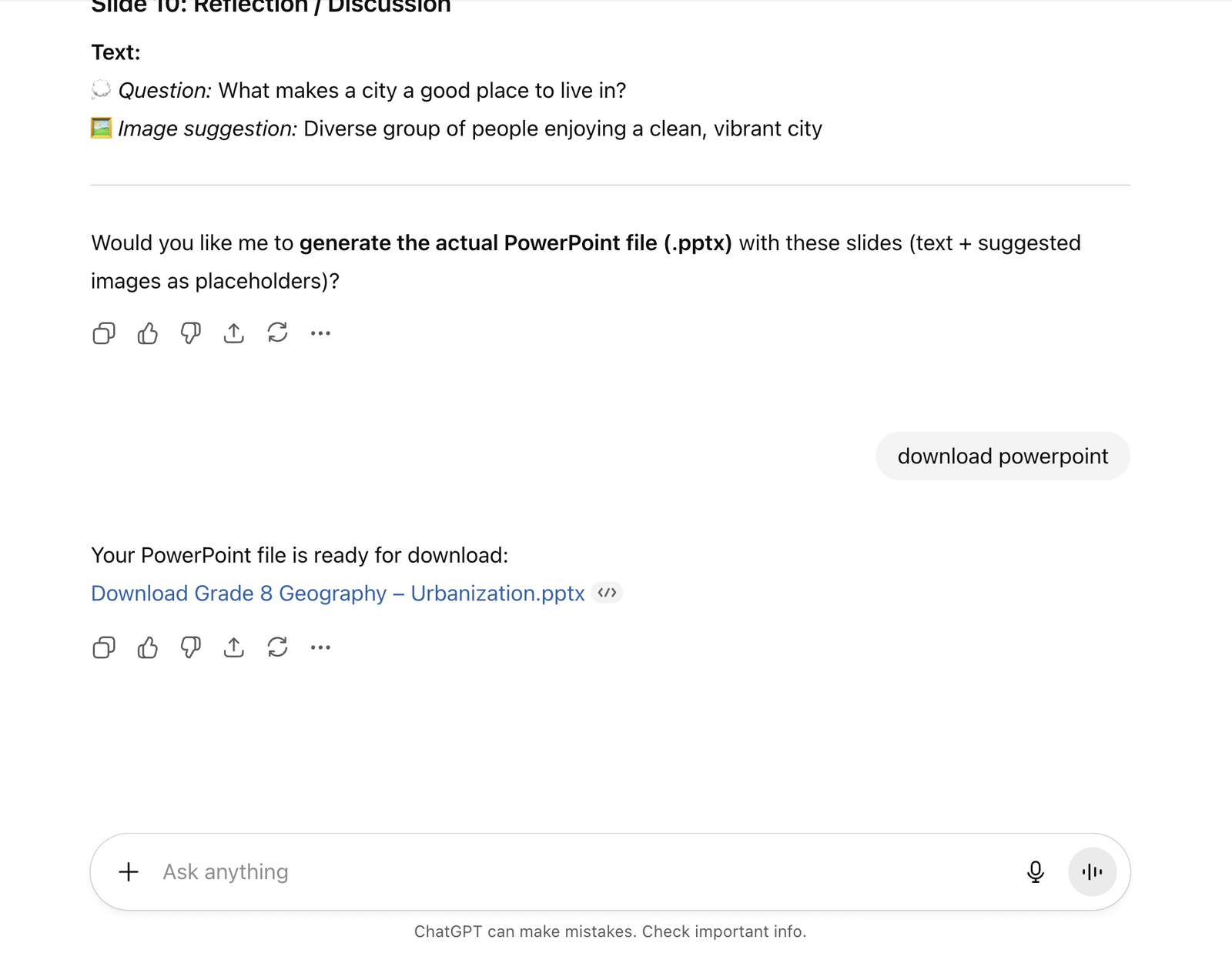 - Start with a clear request. Tell ChatGPT what lesson the slides are for. Include details such as the grade level, topic, and how long the session lasts. Example prompt: “Create a 10-slide PowerPoint for my Grade 8 Geography class on urbanization. Keep each slide short, with one main idea and one supporting image.”