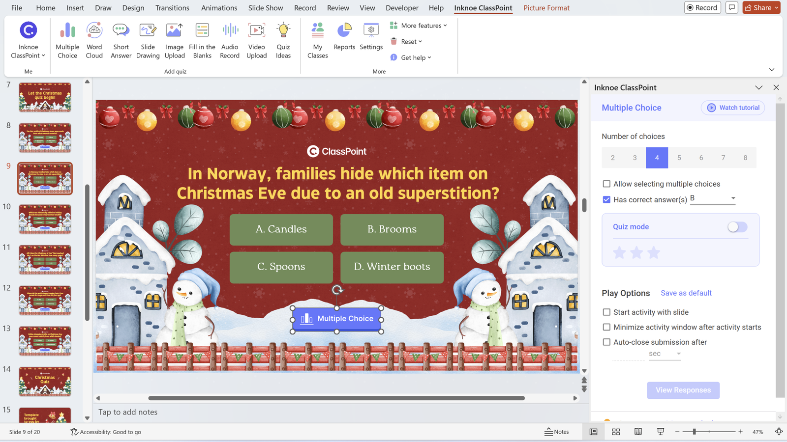 Turn these Christmas quiz questions into interactive MCQs right inside PowerPoint with this template powered by ClassPoint!