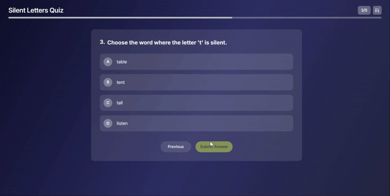 - They work through questions one at a time, each derived from your flashcards, with optional audio (text-to-speech) support.