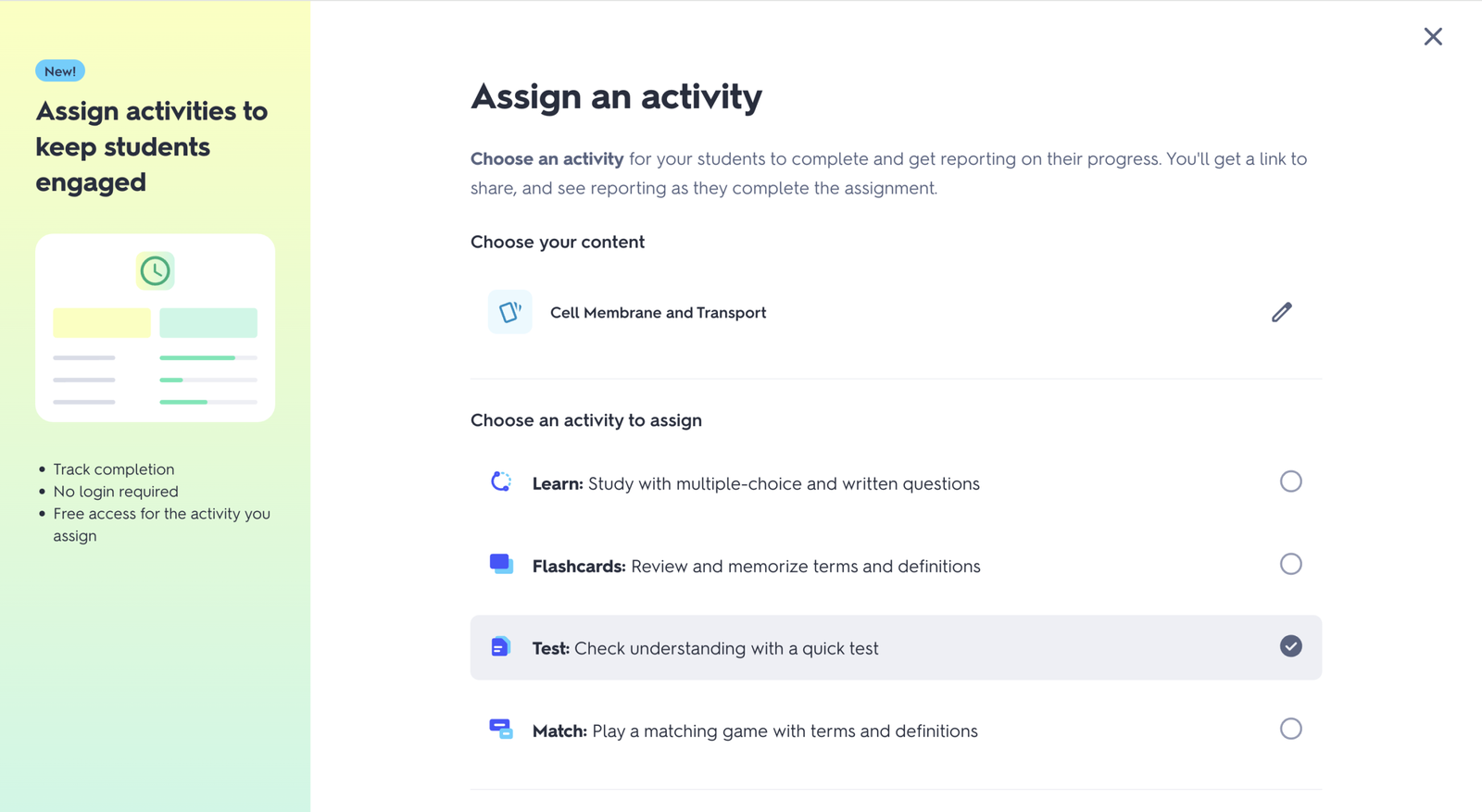 - Learning modes: Assign activities in different modes—Learn, Practice, Match, Test—to support learning, review, or assessment.