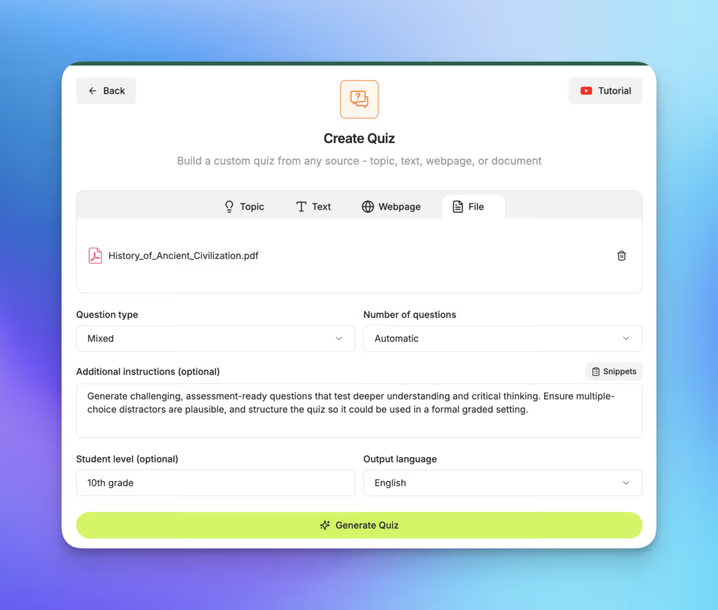 - Additional instructions: Specify grade level, learning standards, or even your exact learning objective when generating a quiz.