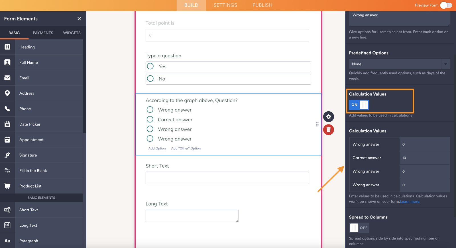- Per-element settings: Adjust fine details like field size, alignment, spacing, and labels for each question or input.