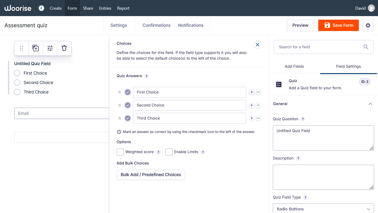 Woorise lets you build quizzes using a flexible drag-and-drop form builder. You can start from scratch or use one of their ready-made templates, then customize.
