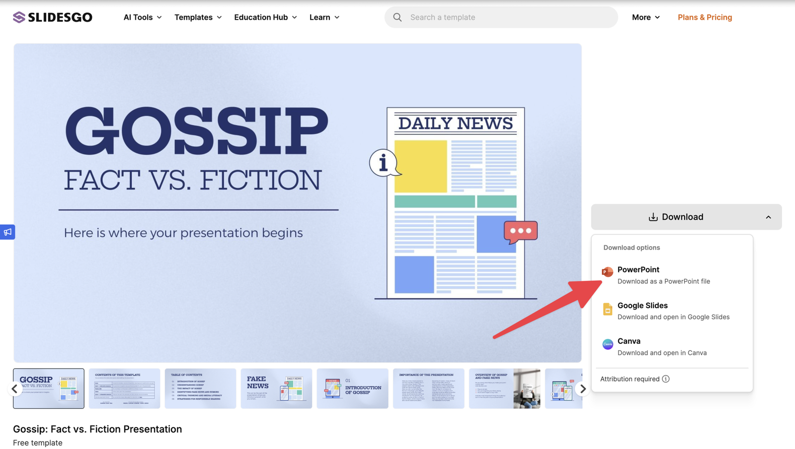 Slidesgo is a web-based resource presenters use to build better-looking slides faster. Its templates download directly to popular formats such as Google Slides, Canva, or Microsoft PowerPoint, so you can use them on whichever platform you prefer.