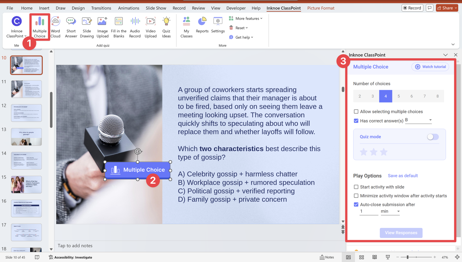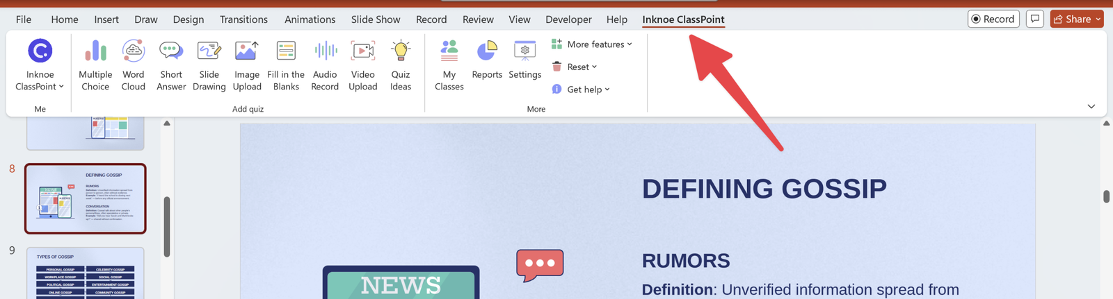 If you haven’t already, install ClassPoint first. It adds a dedicated tab to your PowerPoint ribbon with all the interactive question types ready to use.