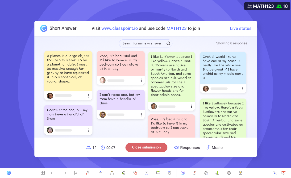 Visual responses are especially effective for diagrams, problem-solving, concept mapping, and creative thinking. They allow the audience to show how they understand an idea, not just describe it. For presenters, these visuals provide immediate insight into misconceptions and reasoning paths.