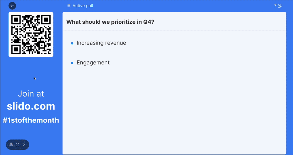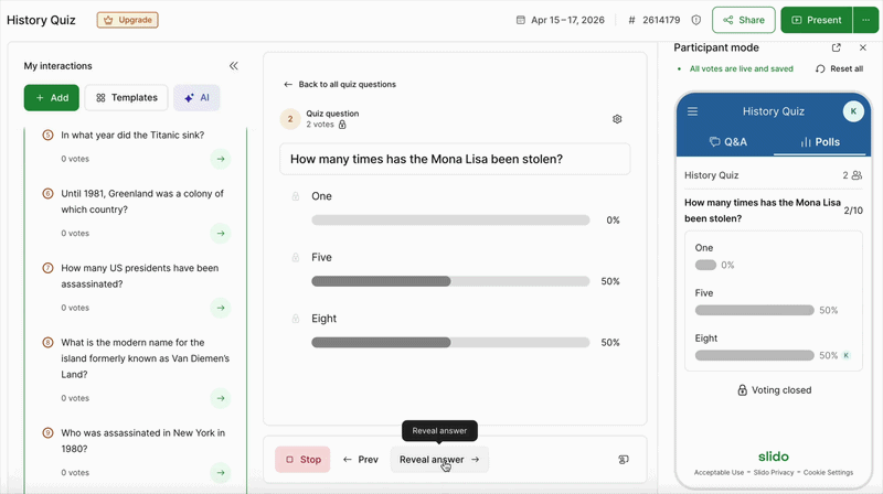 - Control panel — start/stop polls, lock voting, hide or show results, and switch between polls and Q&A without a second device
