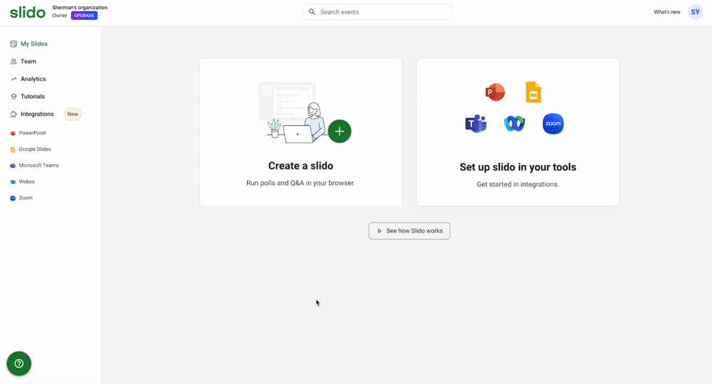 Slido is a browser-based tool for running live polls, Q&A, and quizzes with your class. You create an event in your browser, share a code, and students join from any device. It also integrates with PowerPoint, Google Slides, Teams, Webex, and Zoom — though each integration requires its own setup.