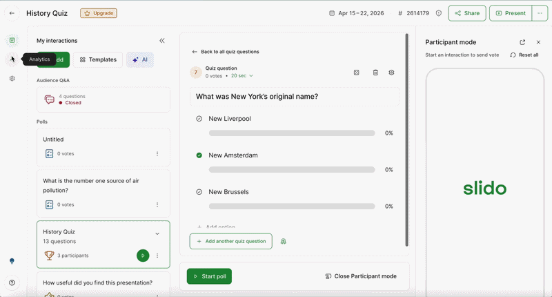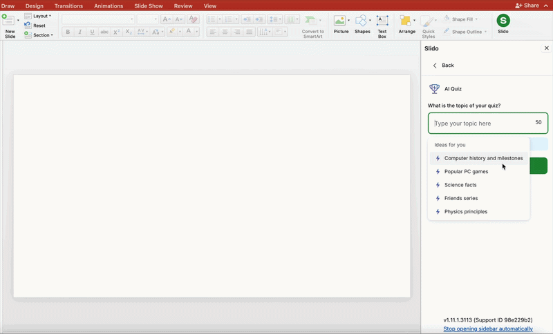 - Slide-based generation — Slido reviews your slides (via PowerPoint or Google Slides) and suggests polls or quiz questions