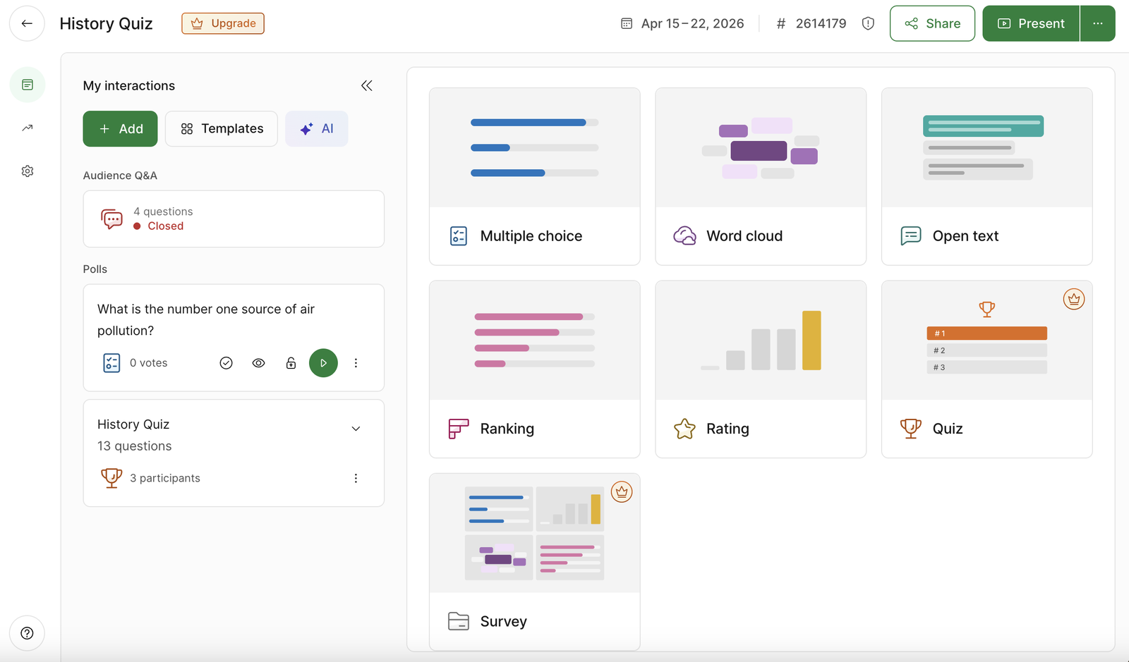 For quizzes, it’s timed multiple choice with a leaderboard. These cover a lot of ground, especially for quick comprehension checks, opinion polls, and exit tickets.