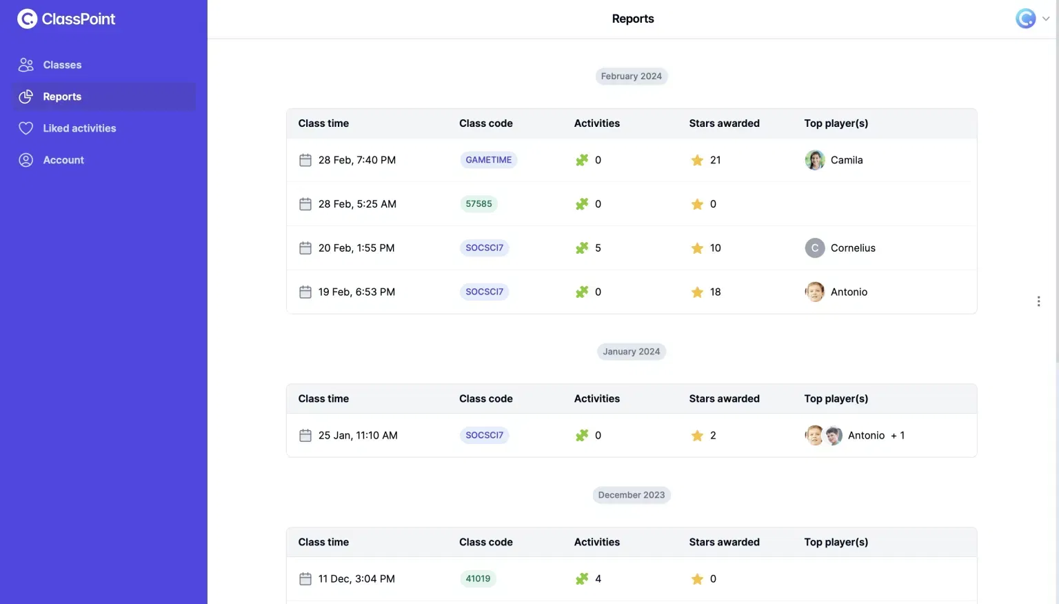 ClassPoint saves session data automatically to a web app, organized by class and by month. Because students join through saved classes, their responses, stars, and levels carry across sessions. Teachers can: