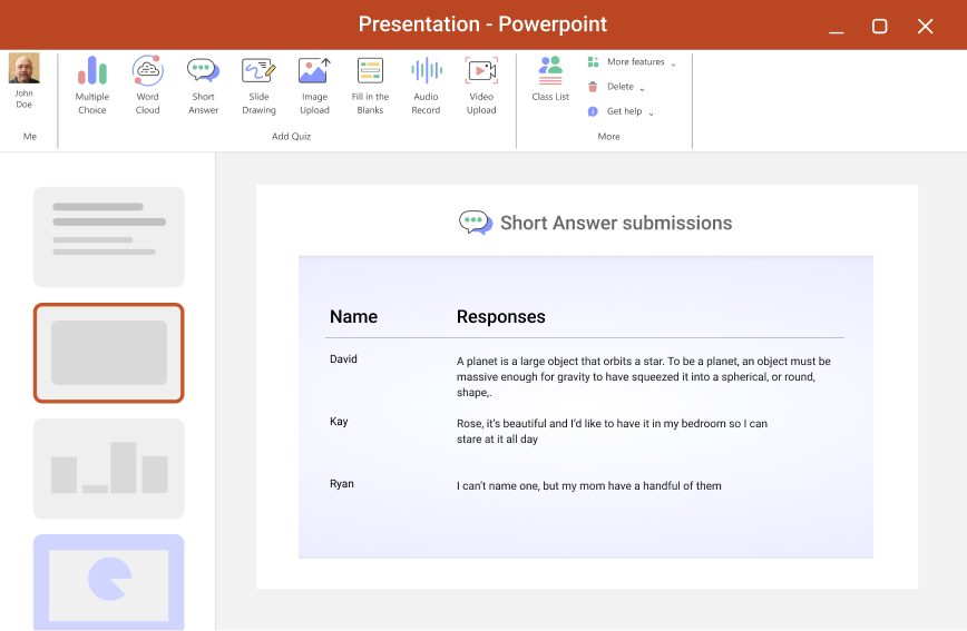 Add a Short Answer activity in PowerPoint with a click of a button. Customize the number of responses allowed per participant, and whether to hide participant names.